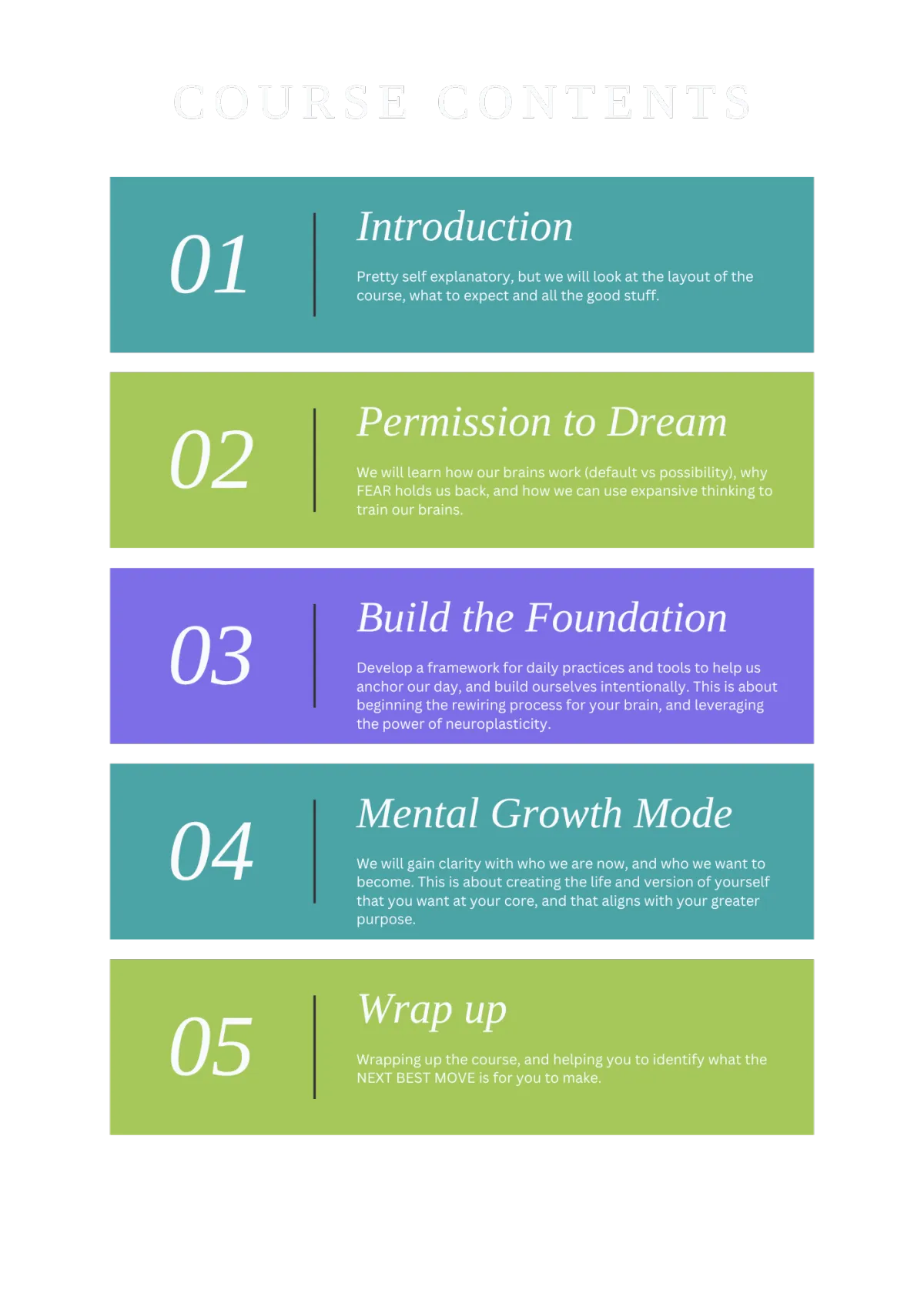 This mini-course is for anyone that is looking to improve their mental performance. While I primarily work with athletes in my coaching, the principles can be applied to anyone that is serious about improving their overall well-being. It's about taking back control over the things that ARE in your control, and being intentional with who you are becoming.